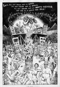 While it could be said that Dave’s strong suit wasn’t his writing, you’d be missing the point. The underground comix movement wasn’t about the perfected series of words and pictures, as much as it was the experience of being into and relating the environment he was living, much the same of most comix artists. Dave’s strengths were in his meticulous illustrative technique, patiently using his design sensibility and luscious ink line work to create a visual world few could compete with. Sheridan constantly set up challenges within his visuals not just to bust his own chops depicting them, but to bring the reader into the world he was existing in, whether it be a drug influenced visual masterpiece, or a sexually influenced dream sequence that would captivate the hormones within my tender loins. His sense of humor put him at the top of the class as well, making you laugh, but also marveling at the wit and verve he conveyed it with.